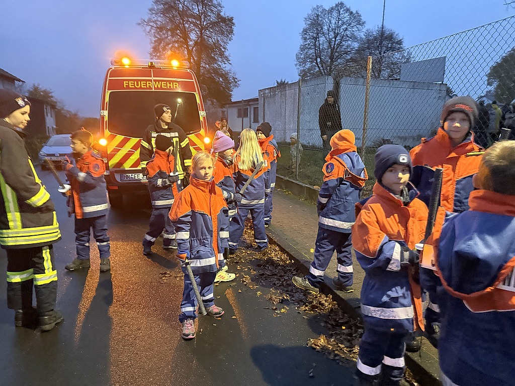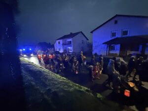 Anschließend bewegte sich der Laternenumzug durch das Dorf. Die Freiwillige Feuerwehr sorgte für die Sicherheit der Teilnehmer. Am Ende verteilte die Arbeiterwohlfahrt wieder Weckmännchen, Kinderpunsch und Glühwein.