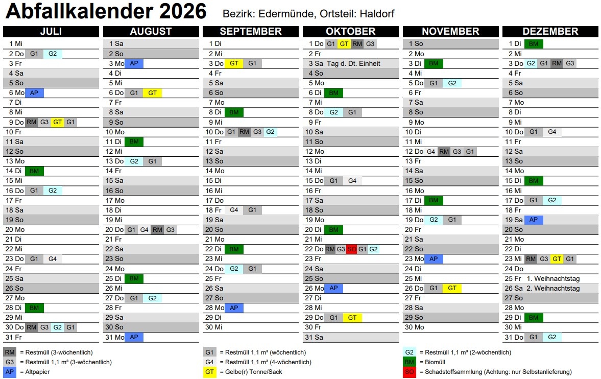 | Grünabfälle | Annahme im OT Holzhausen: März - November: Sa. 10:00 - 14:00 Uhr |